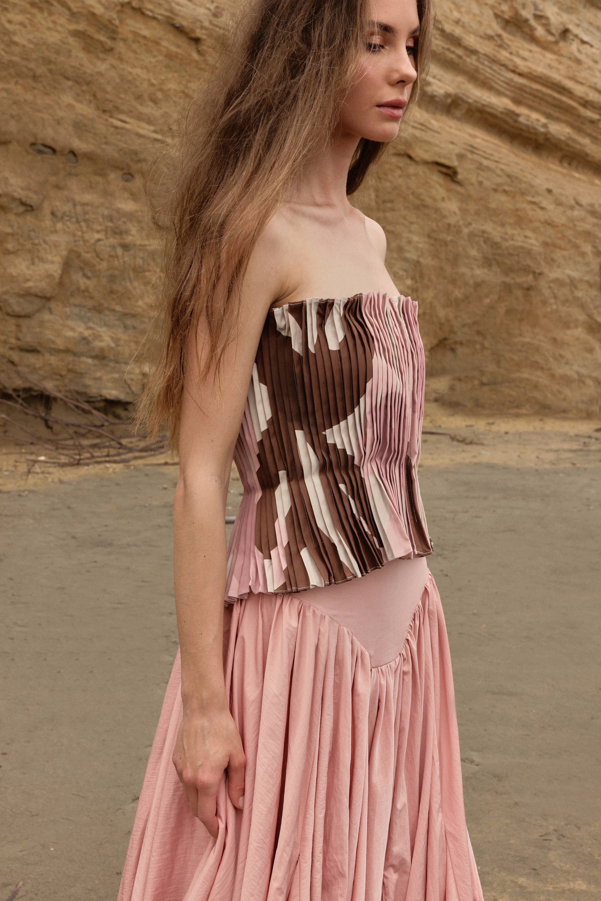 Top strapless plisado con cierre desprendible en espalda.