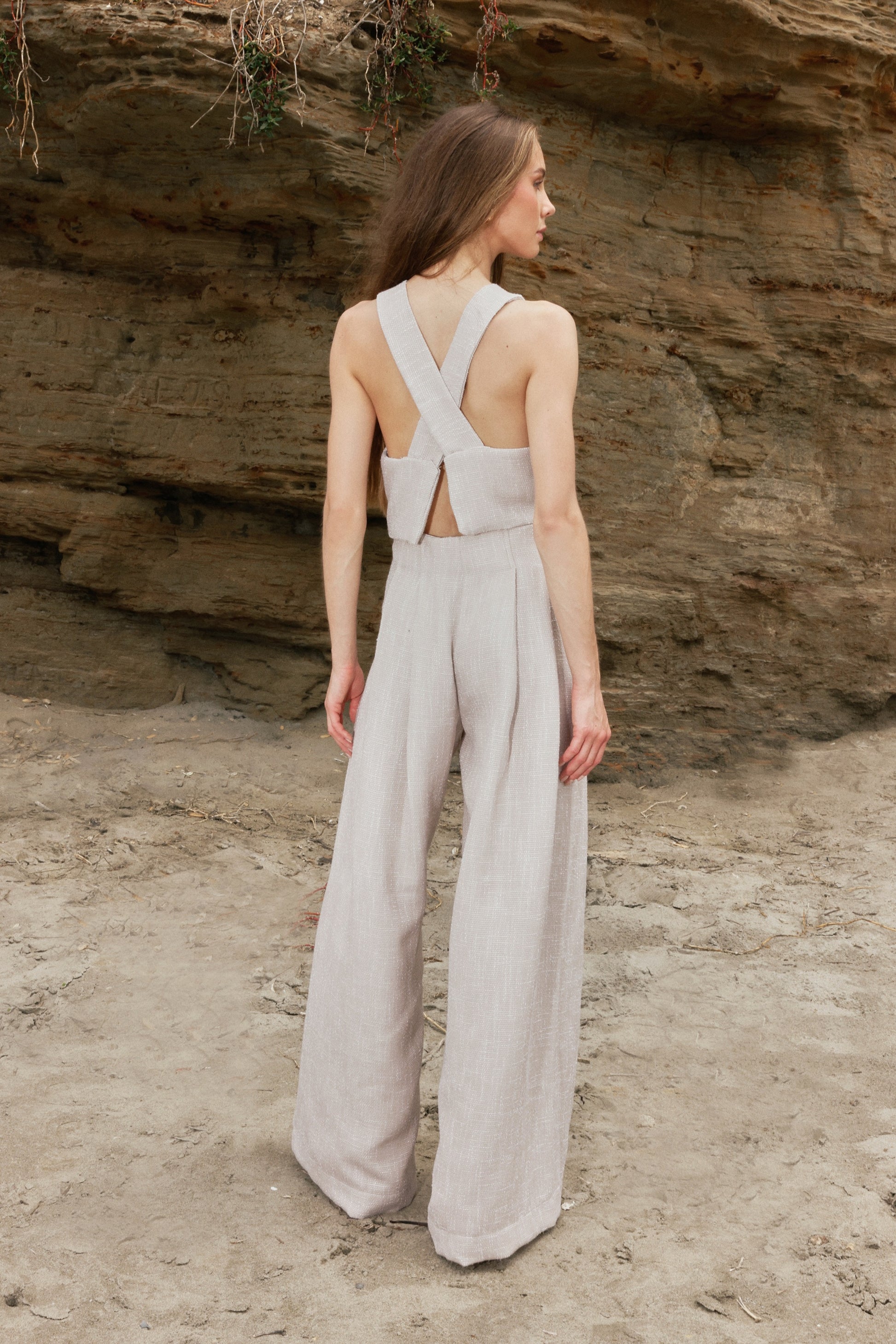 Set de top halter con alforzas delanteras y espalda cruzada. Pantalón palazzo talle alto y pliegues en parte delantera y posterior.